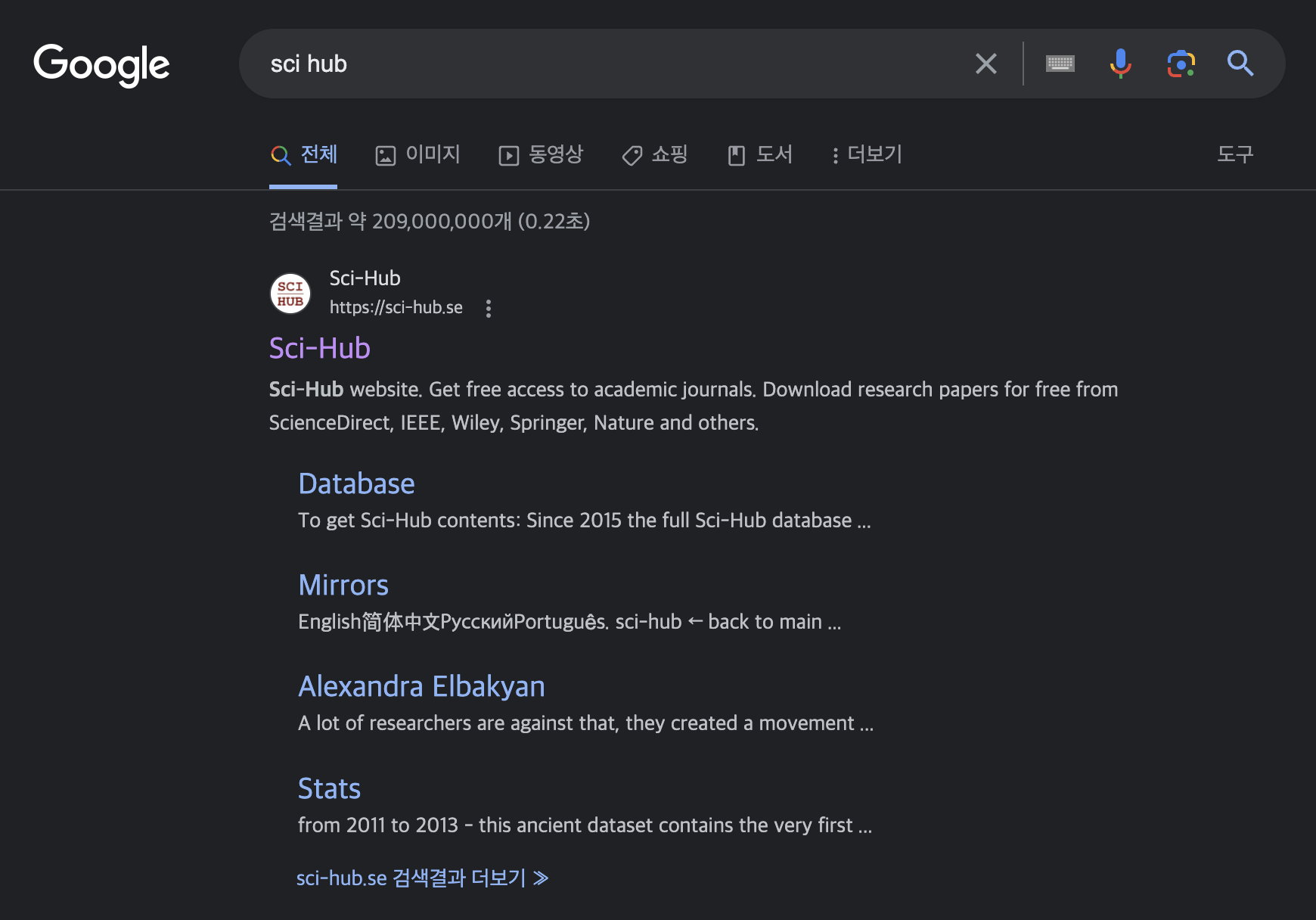 사이트주소가 자주 변경된다하니 꼭 구글 검색창에서 sci-hub를 검색하셔서 사이트에 들어가셔야 합니다. 구글 스칼라에서 유료라 볼 수 없던 논문을 무료로 볼 수 있는 사이트입니다. 논문 제목 검색보다는 검색하시는 것이 더 용이합니다.